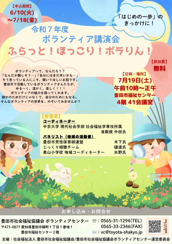 ボランティアセンター地域共生社会の実現に向けて住民参加による地域福祉を進めるため、ボランティアのはじめの一歩となる講演会を開催します。